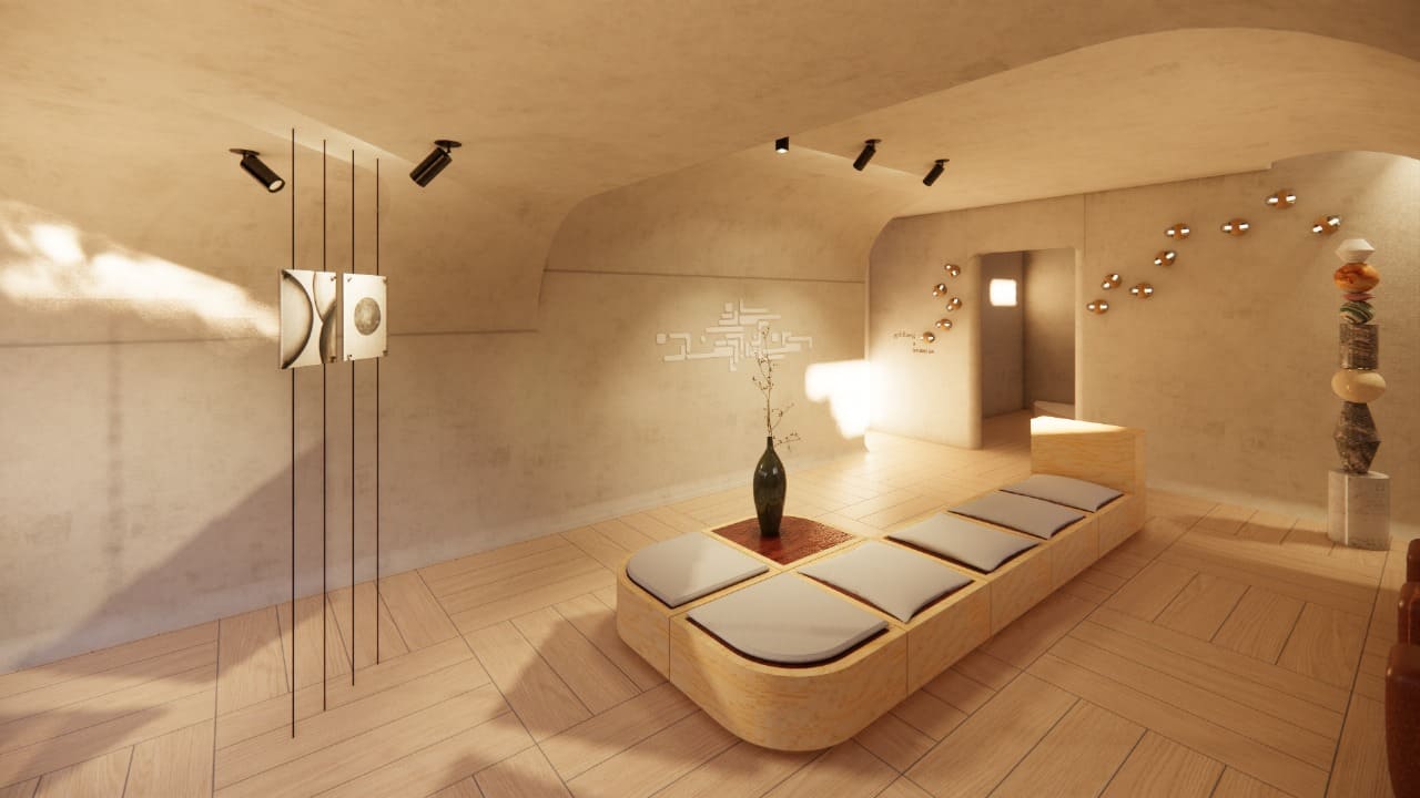 Este espacio se concibe como un santuario inspirado en la proporción áurea, promoviendo calma y reflexión. Cada elemento está seleccionado para fomentar la introspección, disolviendo el ruido exterior y creando un entorno donde la creatividad y la tranquilidad coexisten. Se utilizan líneas limpias y formas simples, con iluminación suave y mobiliario mínimo para favorecer la concentración. Además, se incorporan elementos sensoriales sutiles que enriquecen la experiencia, permitiendo una conexión profunda con el arte y el entorno que alberga.