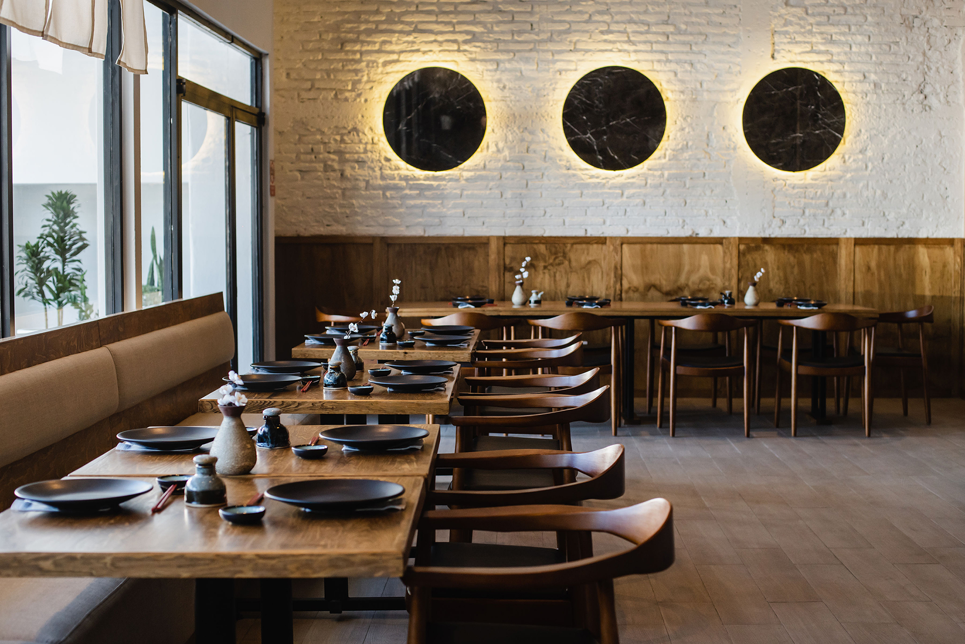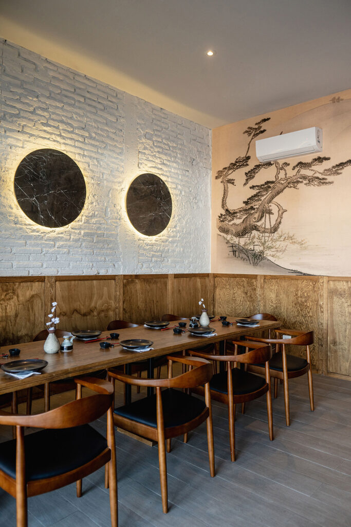 El restaurante equilibra el minimalismo moderno con detalles de diseño japonés tradicional. Cada rincón se ha pensado para ser respetuoso, sobrio y funcional, evitando excesos y privilegiando la atemporalidad.