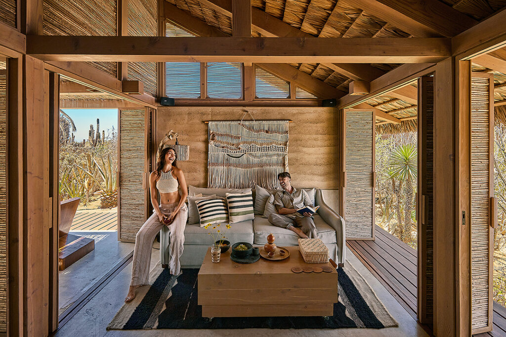 Las villas privadas, llamadas jacales, reinterpretan la tradición con un estilo contemporáneo. Hamacas, cocinas pequeñas, baños al aire libre y jardines con flora autóctona conforman un hogar íntimo. De esta manera, cada huésped experimenta la libertad de habitar el desierto con comodidad.