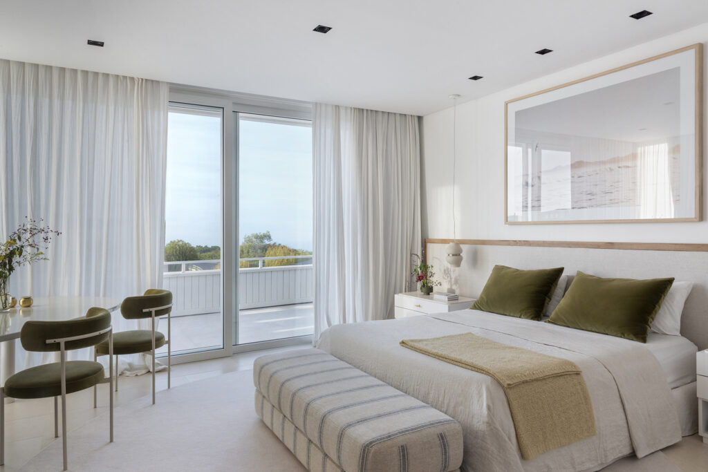 Cada dormitorio prolonga la narrativa de calma: cabeceros de lino, lámparas de cerámica y ventanales que enmarcan el paisaje.