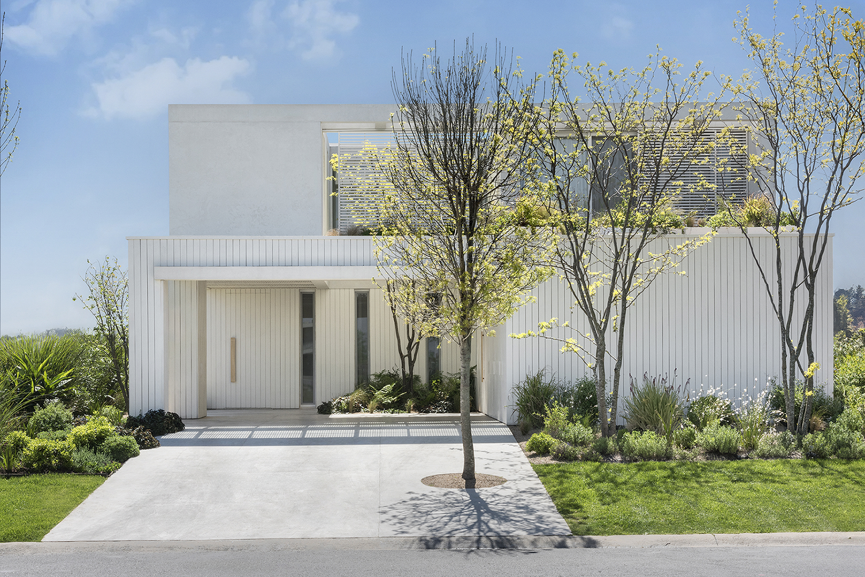 Desde el exterior, la vivienda se percibe contenida y pura. Celosías verticales, sombras sobre el concreto pulido y árboles integrados al diseño refuerzan una arquitectura que protege la privacidad sin perder apertura.