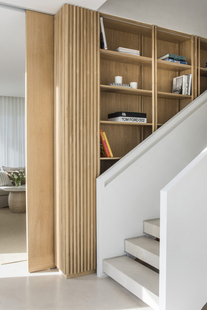 La cocina, con isla de mármol travertino y mobiliario en marfil, se abre al comedor y al exterior. La mesa de madera maciza Anzio y las sillas Canne crean el punto de reunión familiar. En las áreas sociales, alfombras geométricas, ratán y esculturas en piedra completan un paisaje interior introspectivo.