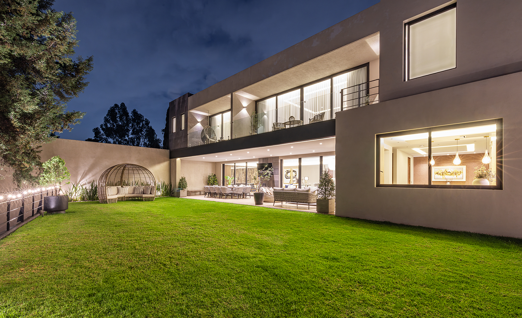 El jardín posterior es una extensión natural de la casa. Concebido como un espacio de reunión y descanso, integra áreas techadas, comedor exterior y mobiliario de alta gama. La iluminación paisajista acentúa la vegetación y realza los volúmenes arquitectónicos, creando un escenario ideal para disfrutar del aire libre con estilo y serenidad.