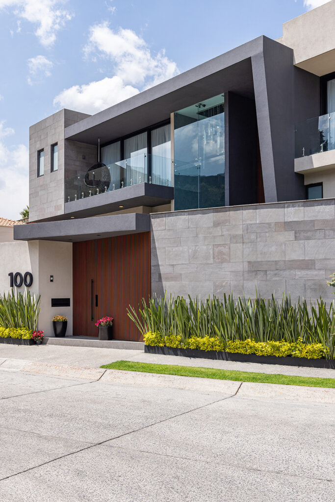 Desde su fachada principal, GG100 revela una arquitectura de líneas limpias y proporciones equilibradas. Los muros revestidos en piedra natural, los acentos en madera y el juego volumétrico de su composición transmiten una elegancia atemporal.