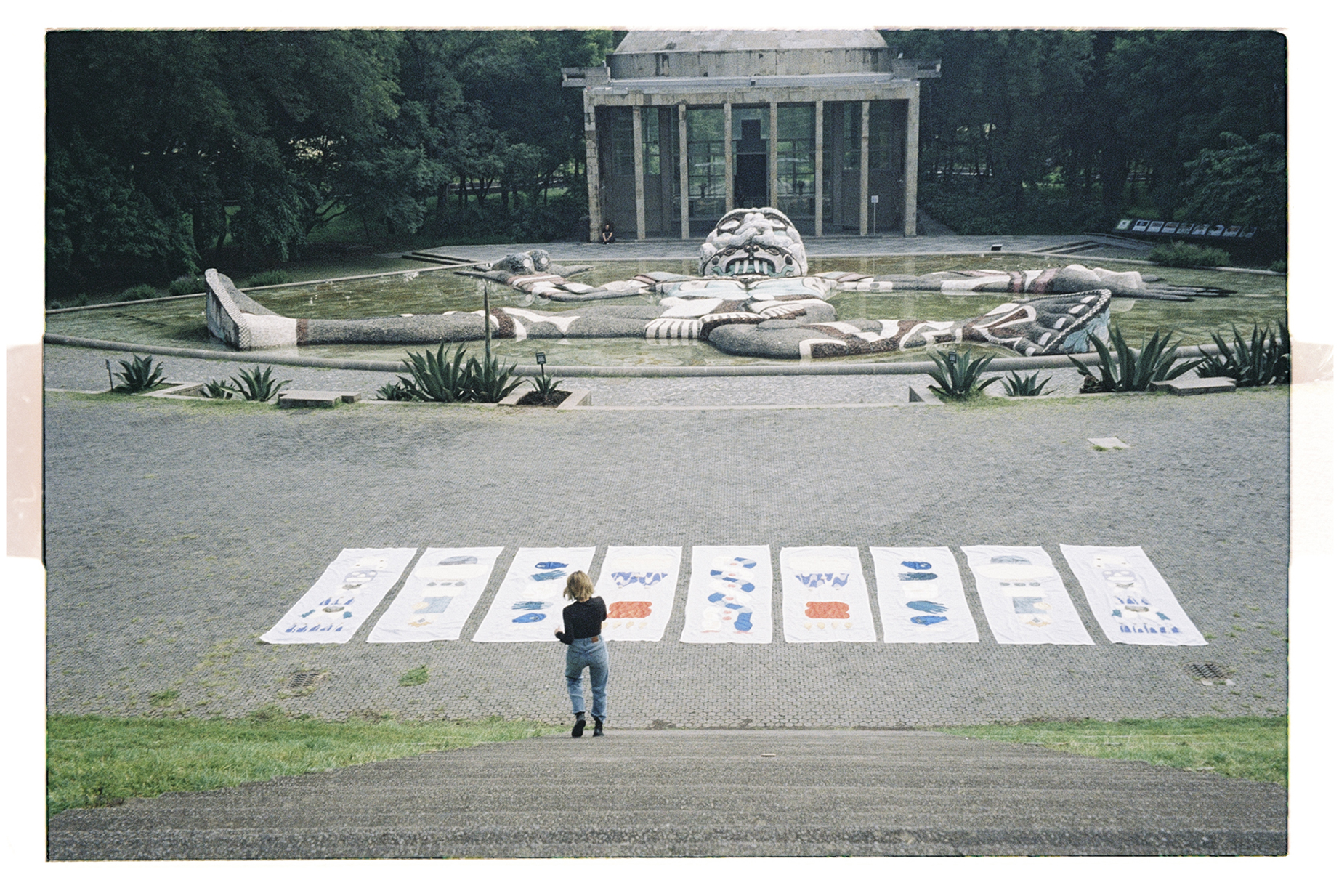- Novena Textil: nueve tótems de 3×1.20 m elaborados mediante zurcido experimental, acompañados por nueve máscaras talladas en madera y un collage de materiales recolectados durante los viajes de la artista.